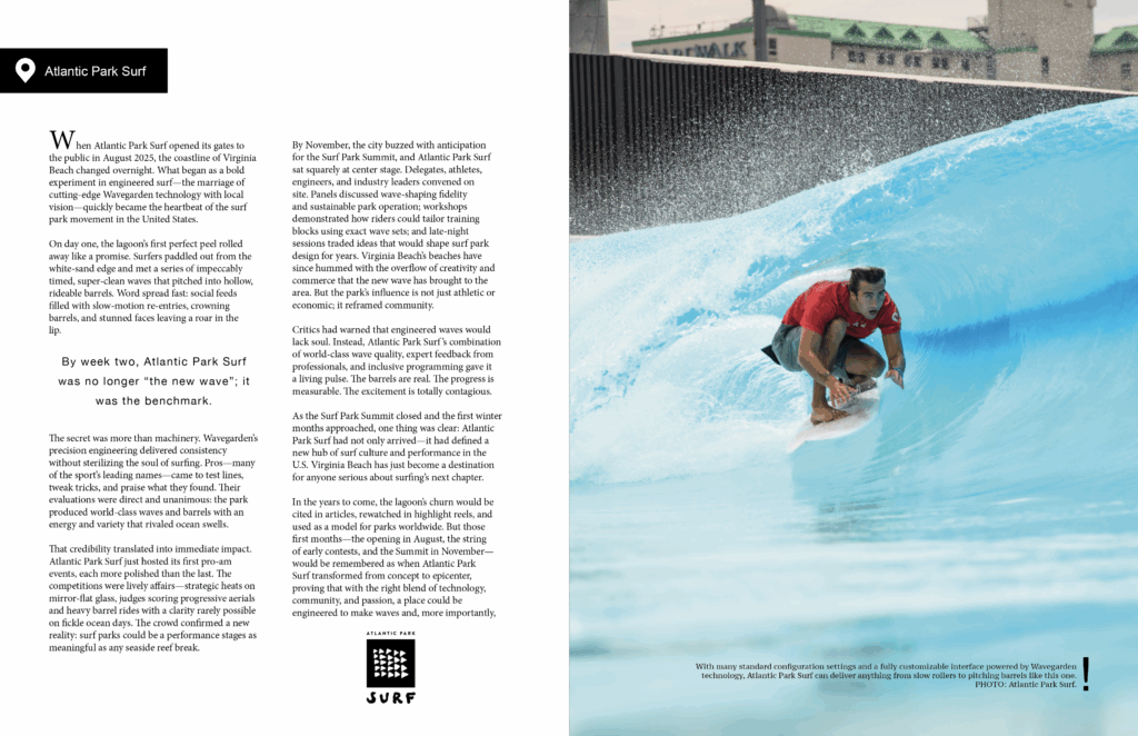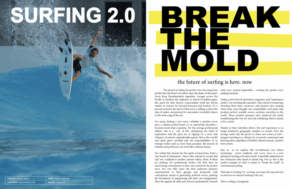 - First-mover advantage in the surf park technology coverage in print: We occupy a unique print editorial niche—making us the ideal partner for companies in the surf park segment, wave pool tech, online media outlets and related surf products.